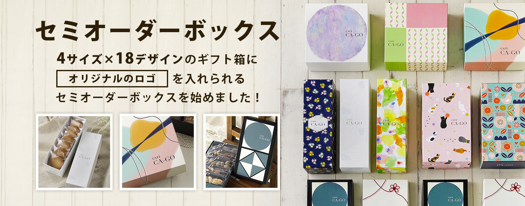 色々なサイズとデザインの箱に、お店のロゴを入れられるオリジナル箱をお楽しみください。